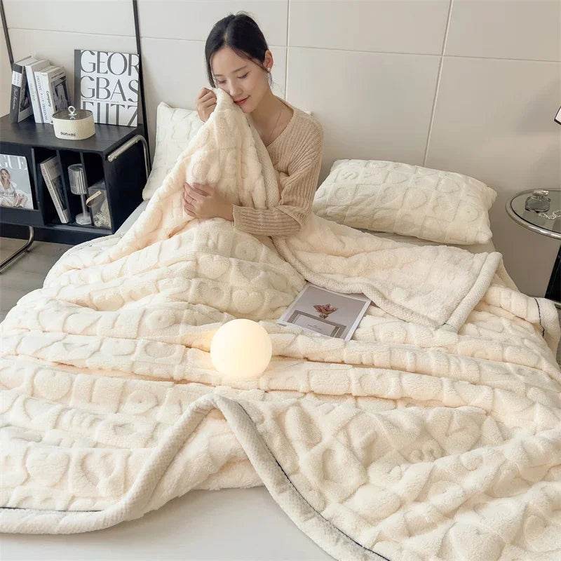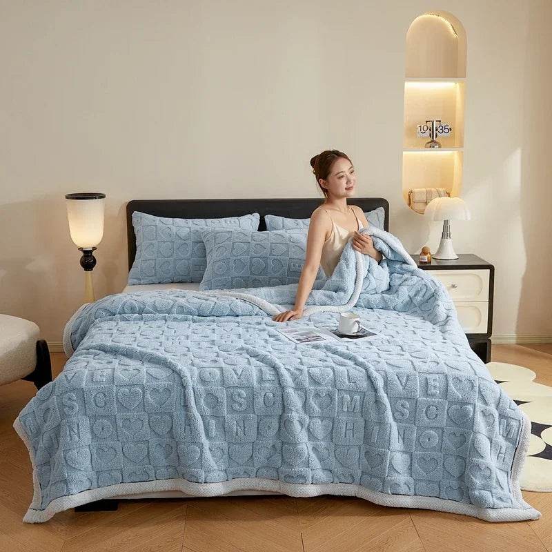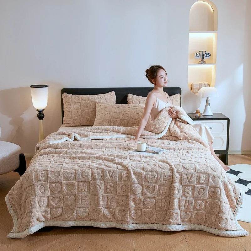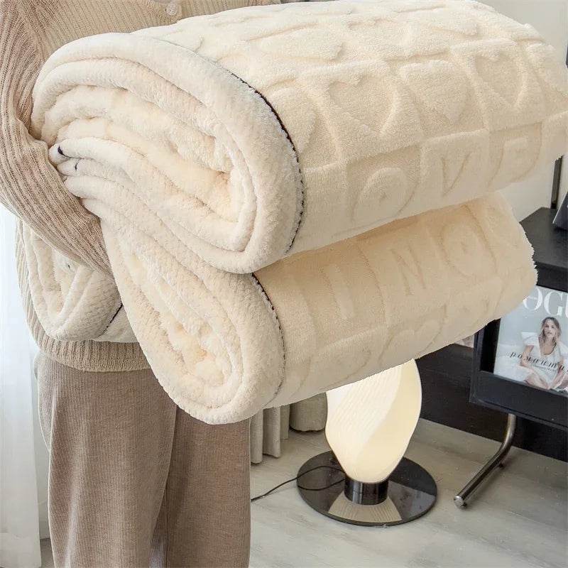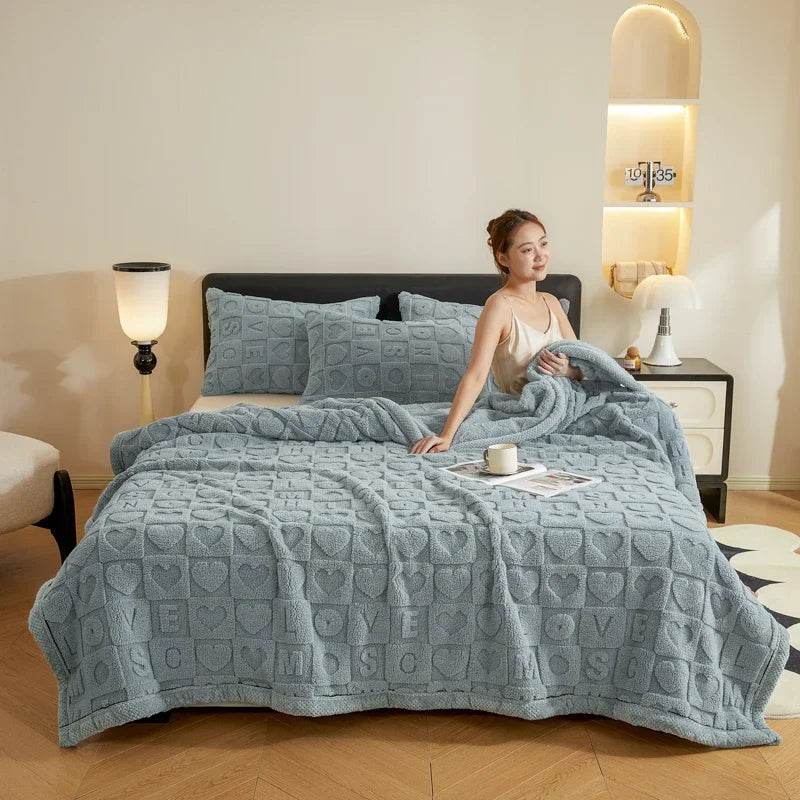 This portable blanket has a warm, solid color with a love heart print. Its fluffy texture and breathable weave make it a stylish home accessory.