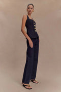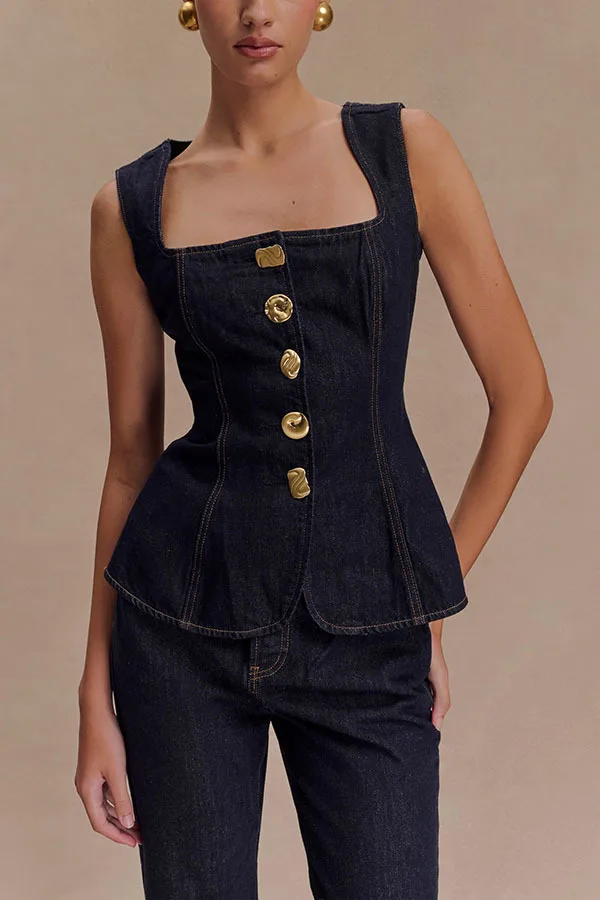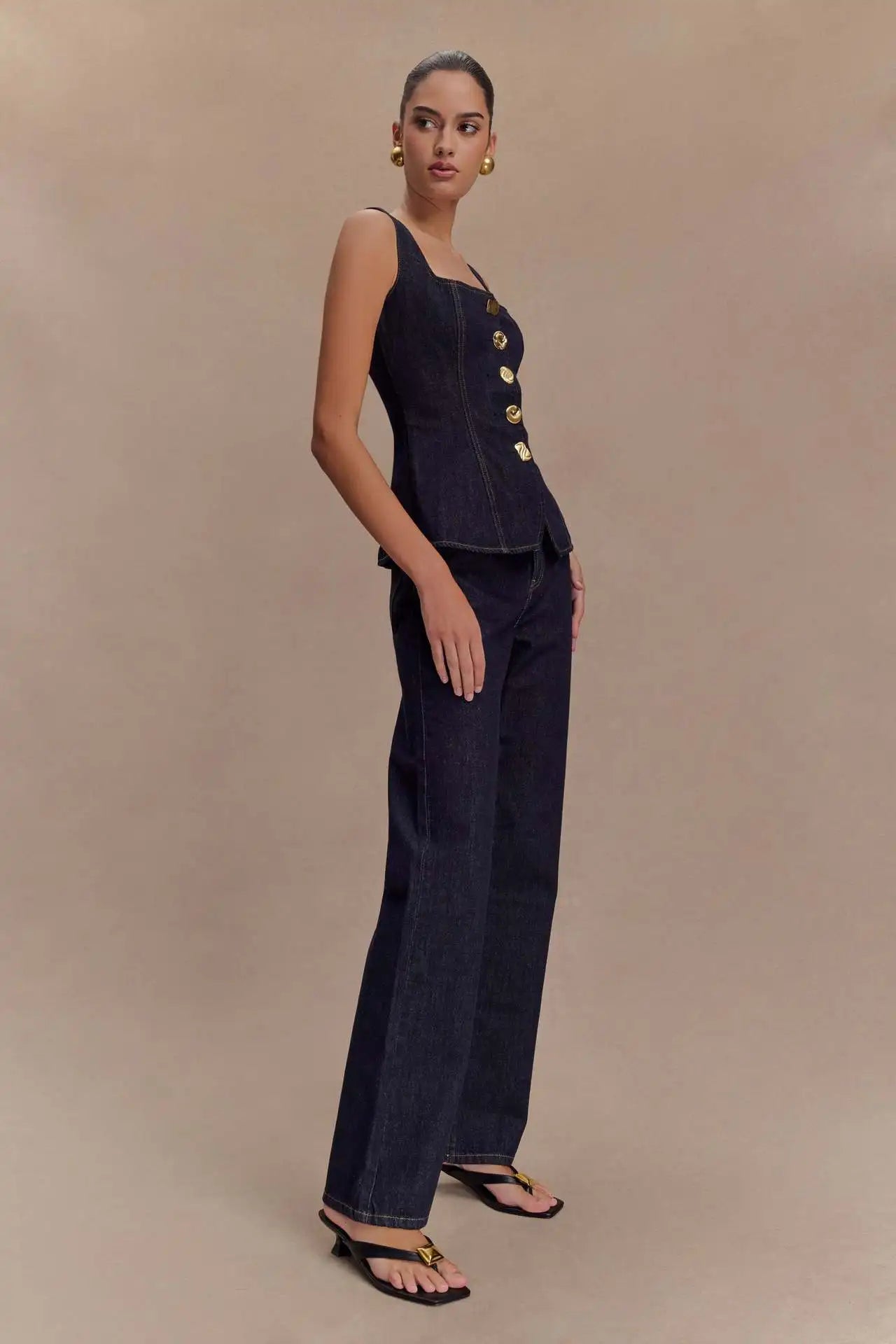 Women's Denim Two-Piece Set – stylish sleeveless denim top with high waist straight leg jeans, perfect for casual spring and summer outfits.