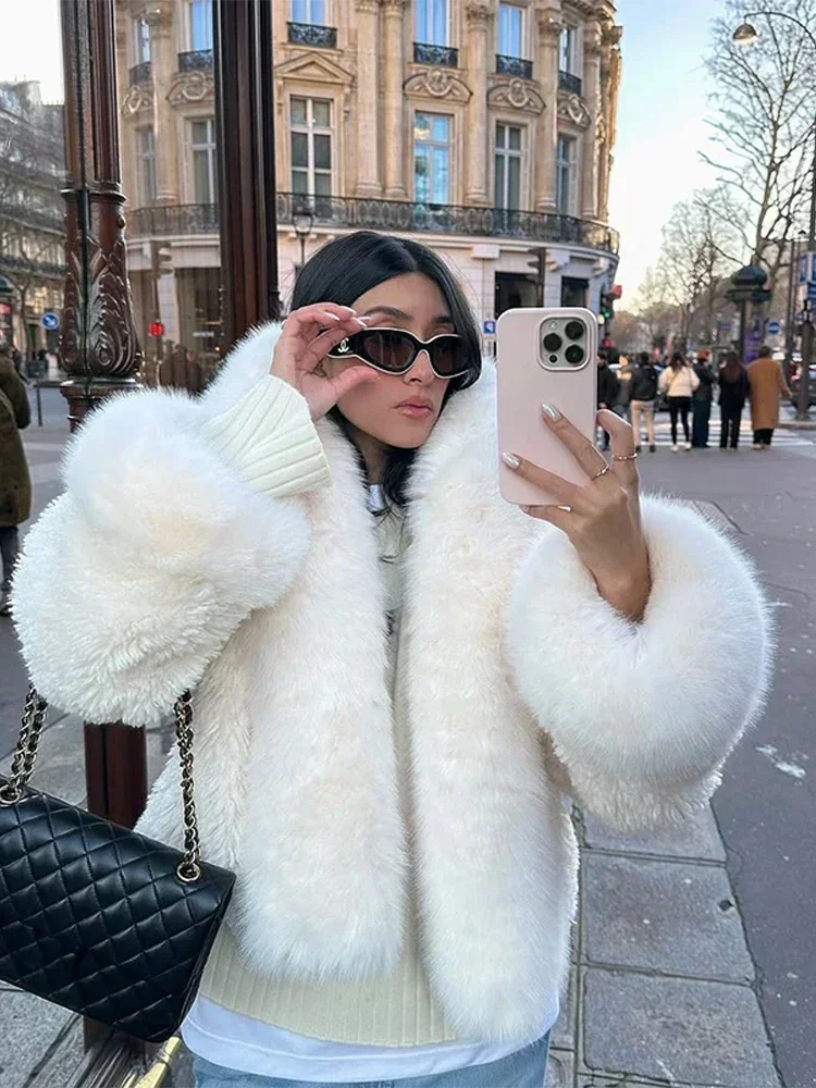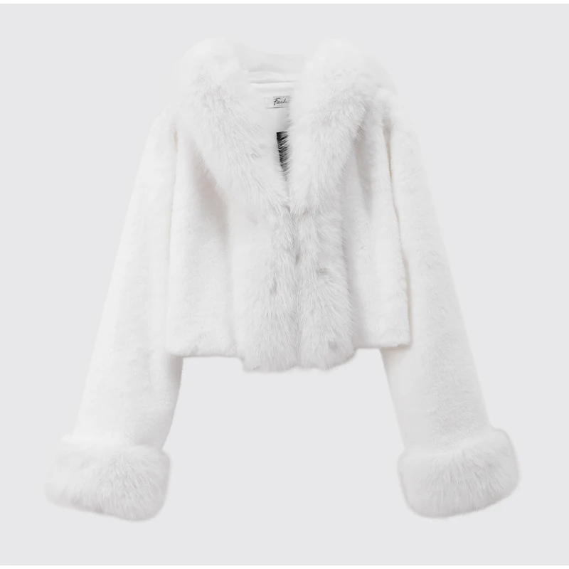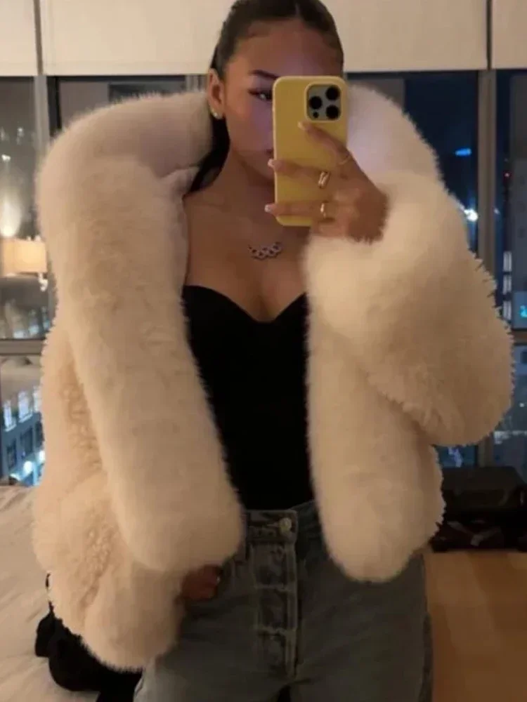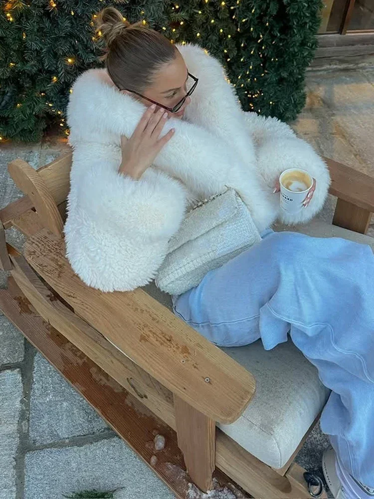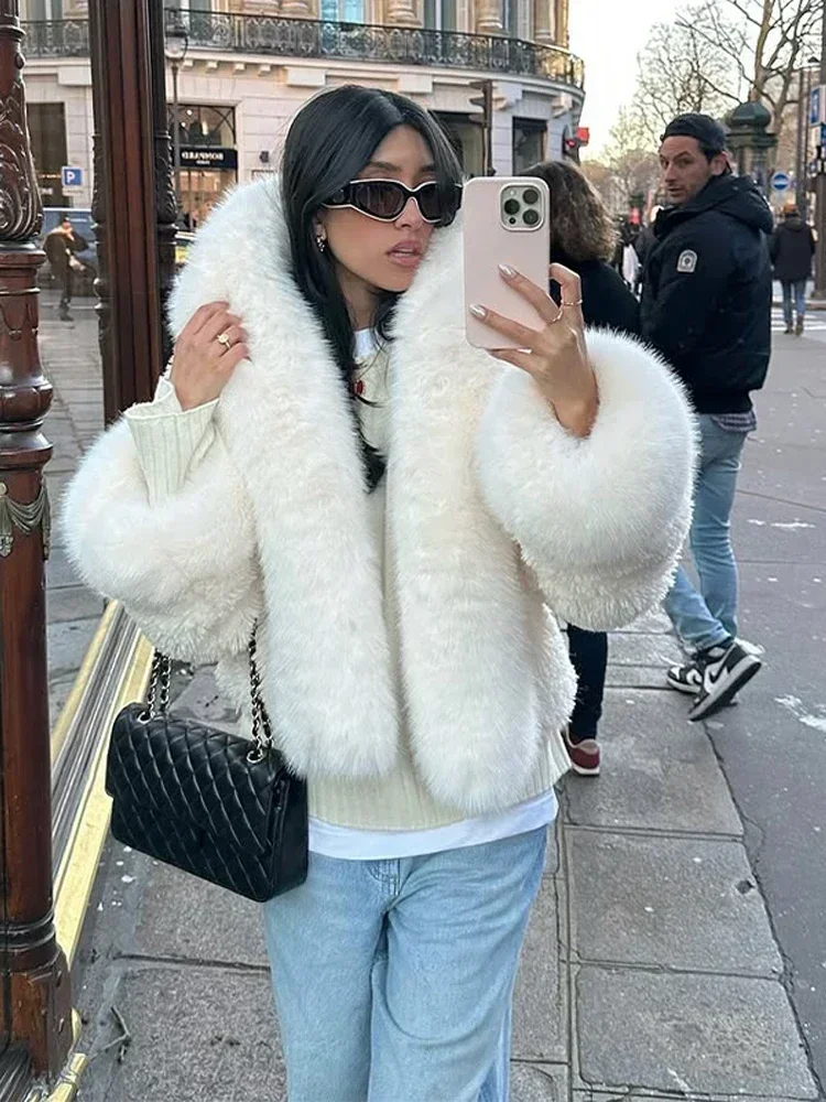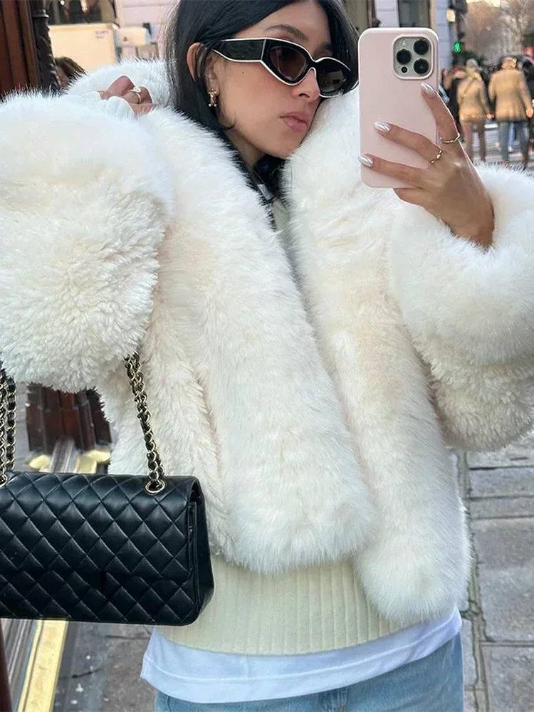 Short faux fur coat with a turn-down collar and full sleeves, designed in a loose, wide-waist fit. Made from high-quality man-made fibers (96%+), offering thick warmth, comfort, and an elegant casual style for autumn and winter wear.