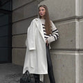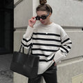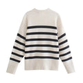 Loose-fit women’s knitted sweater made from a soft polyester blend with medium stretch. Features a classic O-neck, striped design, and long sleeves, perfect for comfortable autumn and winter casual wear.