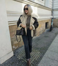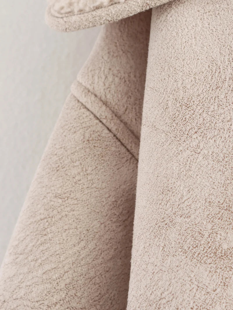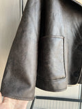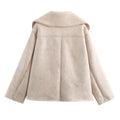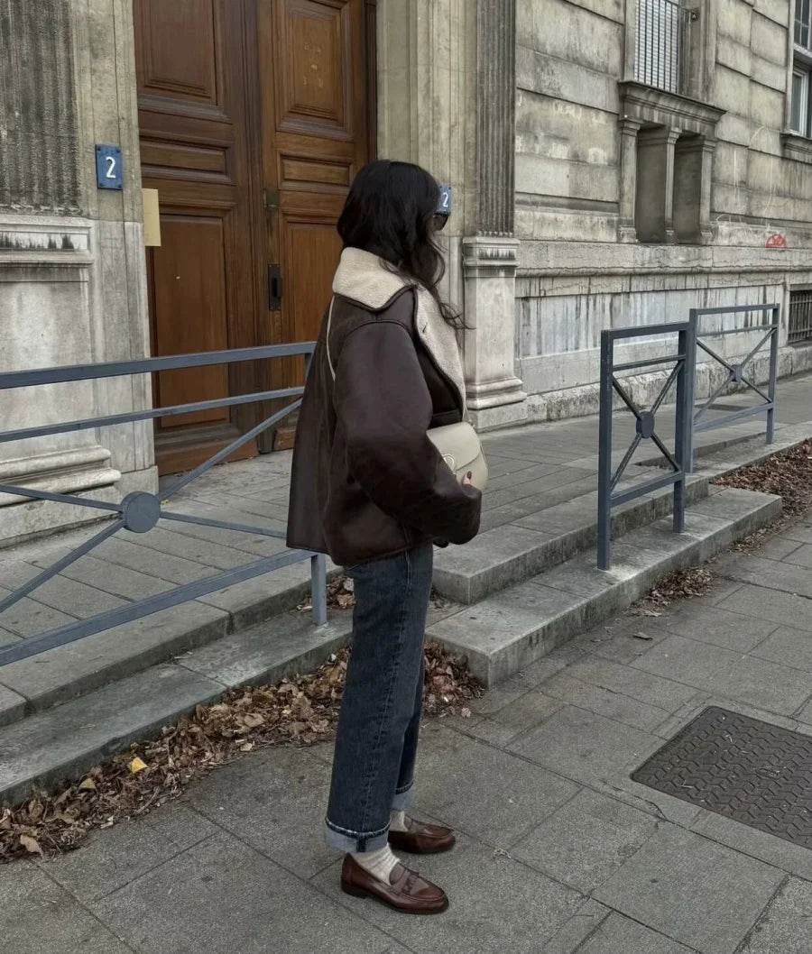 Warm faux leather jacket with double-breasted closure, turn-down collar, full sleeves, and practical pockets. Designed in a casual wide-waist fit with thick faux fur for winter warmth and style.