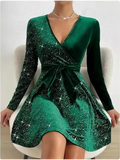 Women’s elegant V-neck dress crafted from polyester and finished with sparkling sequins. Features a knee-length A-line shape with a comfortable regular fit, making it ideal for autumn and winter parties, evenings, and stylish casual events.